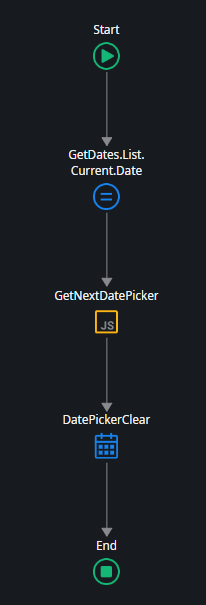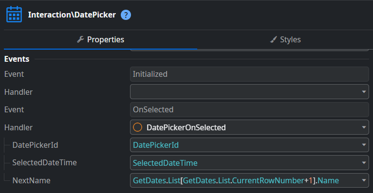 To achieve this, I created a structure containing Name and Date. In the DatePicker’s extended properties, I assigned a CSS class based on the current item’s Name. Then, in the DatePicker’s OnSelected event, I added an input parameter containing the next date’s name. Using a small JavaScript snippet, I locate the next DatePicker widget in the DOM and clear its value.